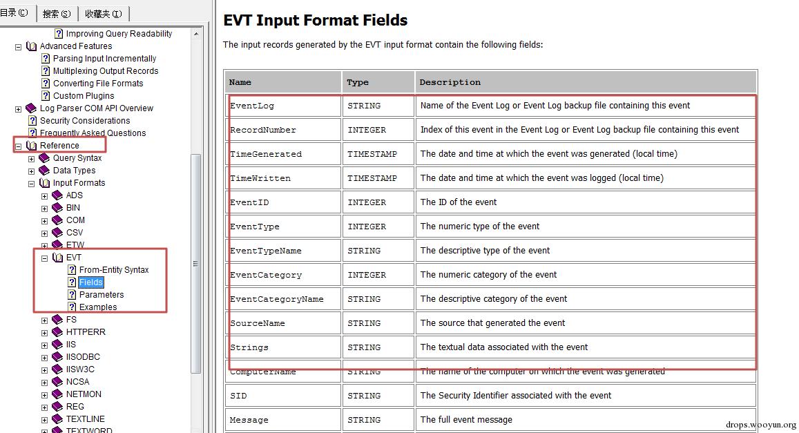 对于每一类字段值的详细意义,我们可以参照logparser的自带文档的参考部分,这里以EVT(事件)为例: