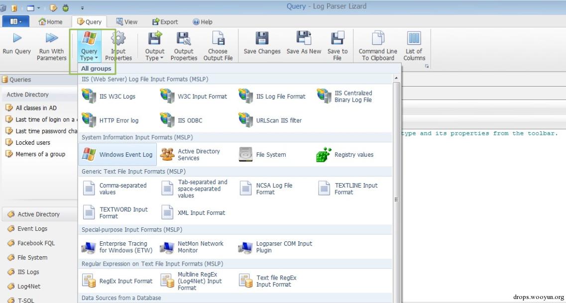 同样我们也可以选择其他输出格式,对日志分析和统计。上述所有操作都是在命令行下完成的,对于喜欢图形界面的朋友,We also have choices!这里我们可以选择使用LogParser Lizard。 对于GUI环境的Log Parser Lizard,其特点是比较易于使用,甚至不需要记忆繁琐的命令,只需要做好设置,写好基本的SQL语句,就可以直观的得到结果,这里给大家简单展示一下 首先选取查询类型