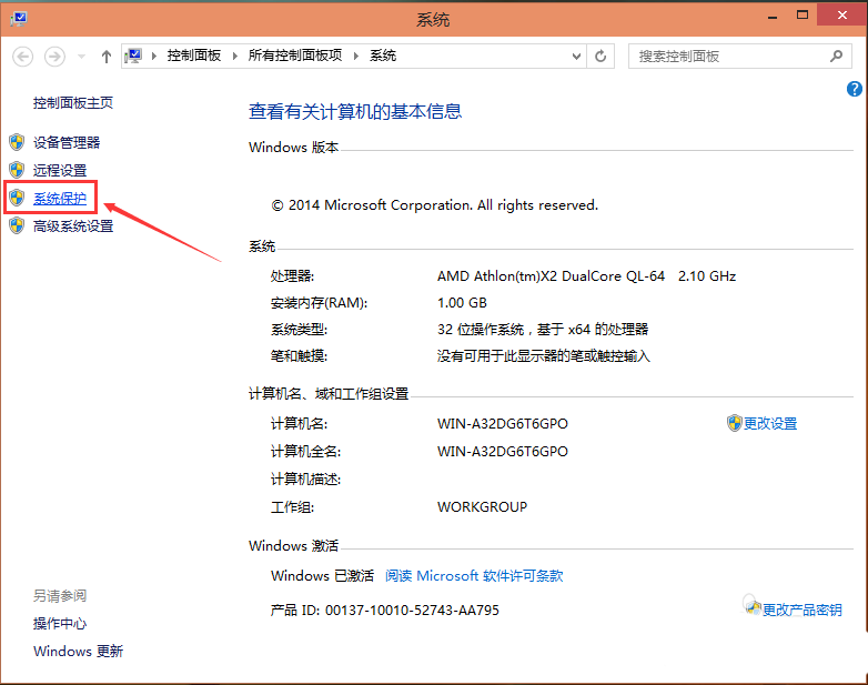 2、点击系统窗口左侧的“系统保护”。如下图所示。