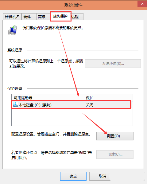 3、在系统属性窗口的系统保护选项卡里,为C盘创建还原点。由于C盘的“保护”关闭,点击“配置”启用保护,如下图所示。
