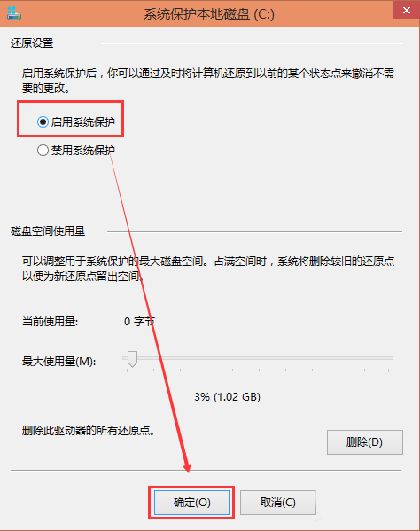 4、选择启用系统保护,然后点击确定,如下图所示。