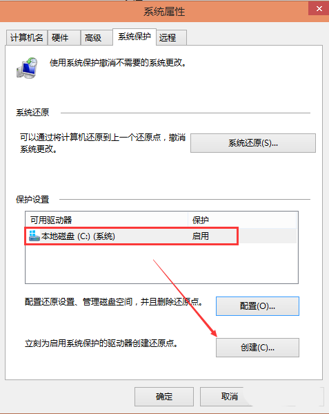 5、点击后返回系统属性窗口,这时C盘的“保护”启用了,点击“创建”立即给启用系统保护的C盘驱动器创建还原点。如下图所示。