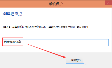 6、在系统保护窗口输入创建还原点的名称。然后点击”创建“,如下图所示。