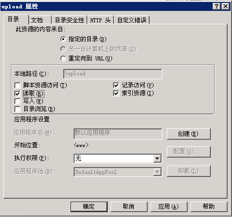 对付上传,我们可以总结为:可以上传的目录不给执行权限,可以执行的目录不给上传权限。Web程序是通过IIS用户运行的,我们只要给IIS用户一个特定的上传目录有写入权限,然后又把这个目录的脚本执行权限去掉,就可以防止入侵者通过上传获得webshell了。配置方法:首先在IIS的web目录中,打开权限选项卡、只给IIS用户读取和列出目录权限,然后进入上传文件保存和存放数据库的目录,给IIS用户加上写入权限,最后在这两个目录的“属性”—“执行权限”选项把“纯脚本”改为“无”即可。见下图
