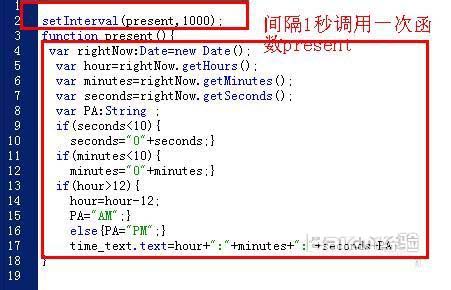8、当下的时间是能够展现出来了,但是我们怎么让表走起来,动态显示时间呢?很简单,我们使用setInternal函数,将代码每1秒钟调用一次,这样就能够显示钟表的动态了。如图所示,下面的大方块中是上面写的代码,将这些代码都定义到present函数中,然后调用函数present