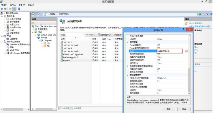 2. 再次右键myweb应用程序池,高级设置,看到有一个节点叫“进程模型”,修改标示一项,为LocalSystem。搞定。