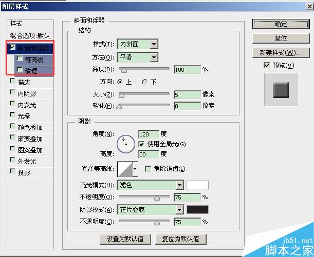 4、弹出“图层样式”窗口,设置“斜面和浮雕”、“投影”;