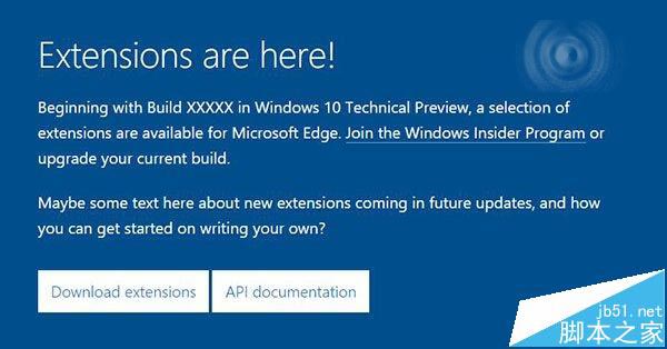 在这个页面中微软提供了两个扩展下载,并给出了安装步骤。不过在目前的Build 10586中,Edge浏览器似乎还不支持扩展,因此还无法运行。该页面主要针对开发者推出,微软还提供了API开发文档(目前还不可用)。