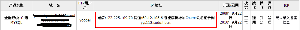 从上图中的“IP地址”栏里可以看到,我的双线空间除了有一个电信IP和一个网通IP以外,还有一个“智能解析CNAME ”的地址为“yys113.sudu.hi.cn. ”这个地址就是用来做CNAME记录的。