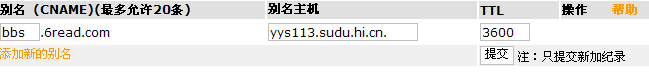 在域名前面填入“bbs",在“别名主机”栏里填入空间提供的智能CNAME地址“yys113.sudu.hi.cn. ”。这里需要注意的是,CNAME地址后面都有一个“."号,在输入的时候千万不要忘了把这个点给输入进去,如果忘了将有可能无法成功解析。输入完毕后点击“提交”。
