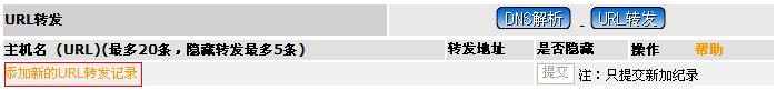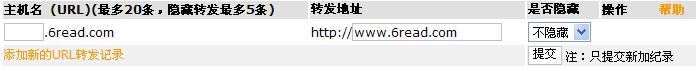3)、因为我是要将6read.com转发到www.6read.com,所以我在“主机名(URL)”栏里留空,在“转发地址”栏里填入了www.6read.com,在是“否隐藏”里选择了不隐藏然后点击“提交”: