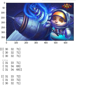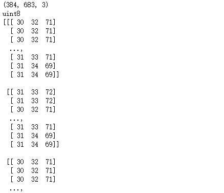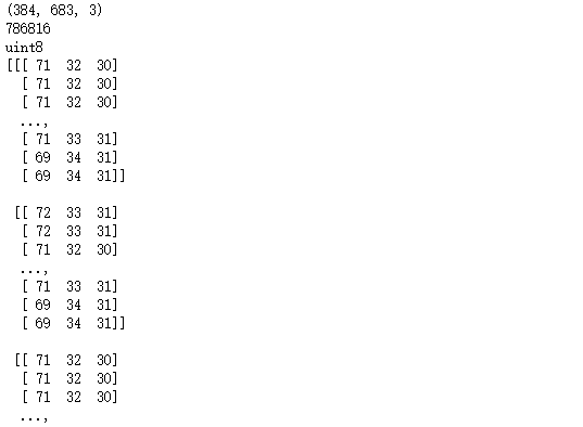 #plt.imread读入的就是一个矩阵,跟opencv一样,但彩图读进的是RGB,与opencv有区别 print(image.shape) # (h,w,c) print(image.size) print(image.dtype) print(image)