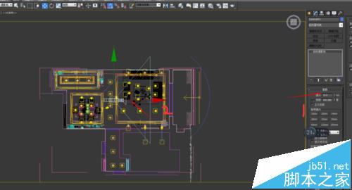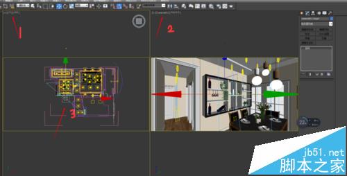 4、将场景切换为顶视窗与摄像机视窗,在顶视窗中移动相机位置,尽量在需要看到的360°场景的中央,并移动摄像机目标点对其进行360°移动观看场景,做出调整争取能看到最好的位置。