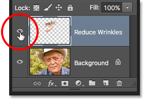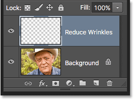 在图层面板中,可以看到新建的命名为"减少皱纹"的空白图层,这时以蓝色表示该图层正在选中,下面进行的任何操作都只对当前图层生效,不会影响下层图层。