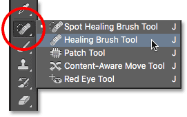 在工具栏中选择修复画笔,修复画笔默认隐藏在污点修复画笔的下拉菜单中,右击在弹出菜单中选择修复画笔工具。