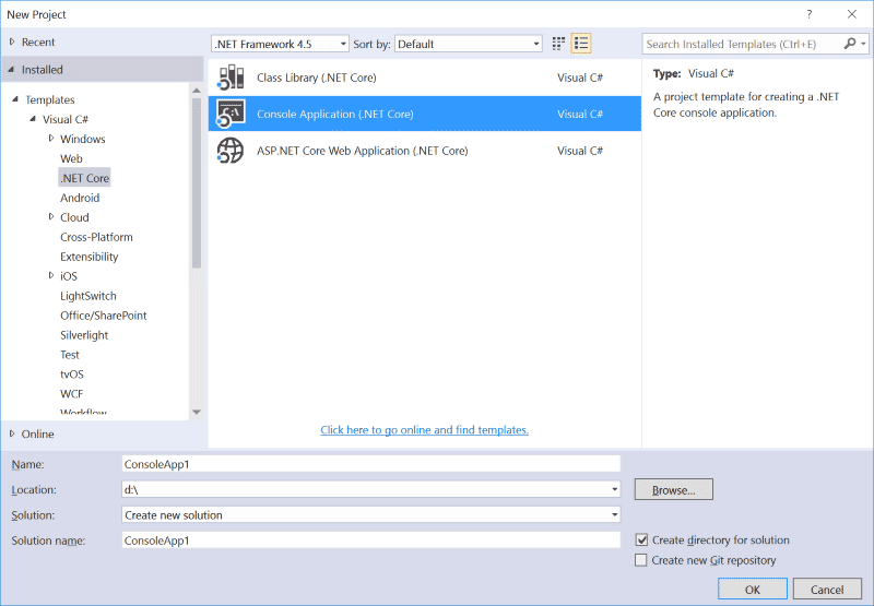 为了简单起见,我们创建的时候,直接选择VS .NET Core tools自带的模板。
