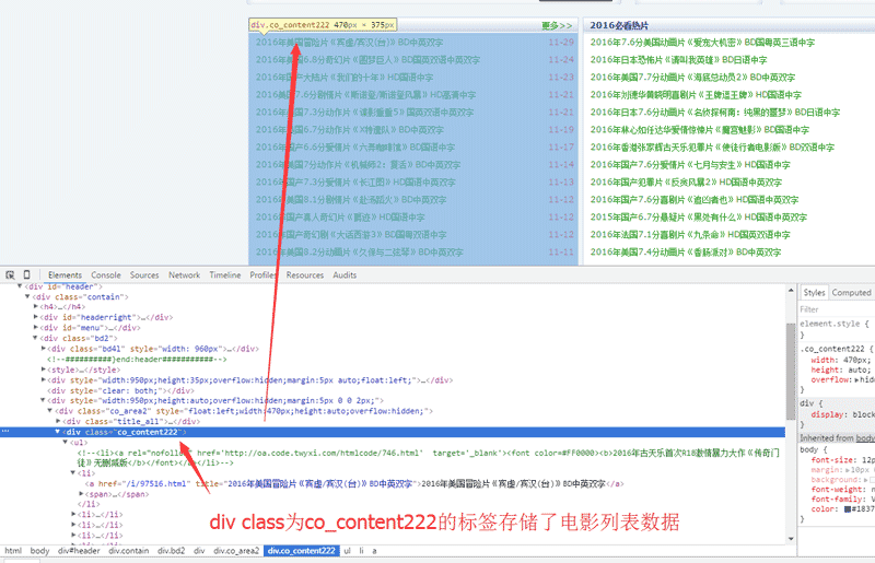 www.dy2018.com首页的电影数据存储在一个class为co_content222的div标签里面