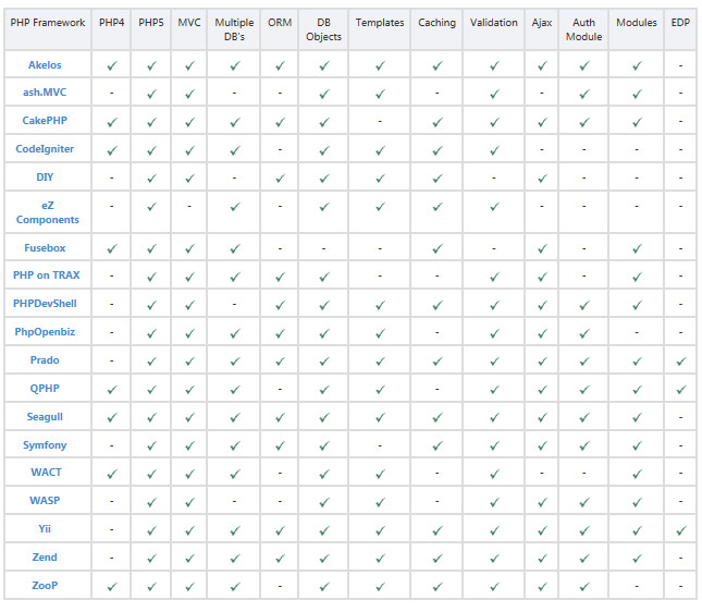 自接触PHP开发以来,已使用了不少框架,虽然对每个框架都没有专研至深,但对每一款所使用的PHP框架功能都有一些了解的。至此,本人将大家常用的一些PHP框架功能整理成表,希望对大家在选择PHP框架时,可以做一定的参考。
