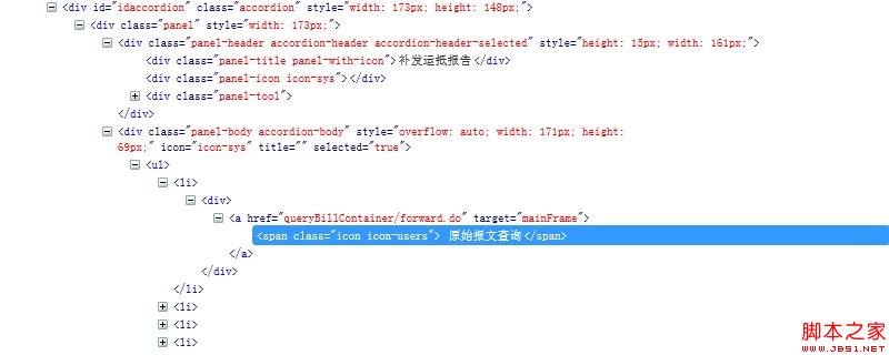 3、问题是该选中的是选中了,但选中的子菜单的父菜单并没有展开。easyui中的panel有个expand方法,但是怎样知道哪个panel(既父菜单)应该展开呢?如图2所示:一直选中了“原始报文查询”,现在要让补发运抵报告这个父菜单展开。“原始报文查询“所在的元素span的祖先节点的兄弟节点的第一个子节点才是”补发运抵报告“所在的节点。