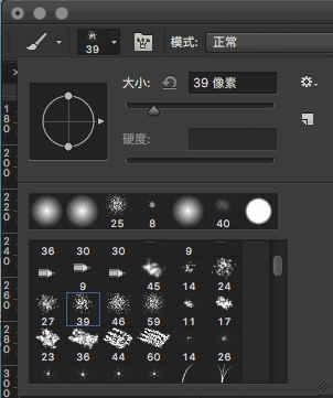接下来是准备工作的最后一步:选笔刷。截图显示的是ps自带的。也可以自己下一些~目前我用的是39号周围的这几个小点点样子的笔刷。??