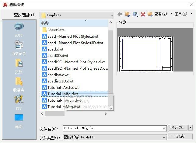 在新建文件时,低版本会让我们选择英制或公制,到高版本会直接让我们选择一个样板文件,其实两种差不多,以前让选择的英制对应的样板文件是acad.dwt,公制对应的acadiso.dwt。AUTOCAD还提供了一些其他的样板文件,有些样板文件甚至还带图框,如图所示。