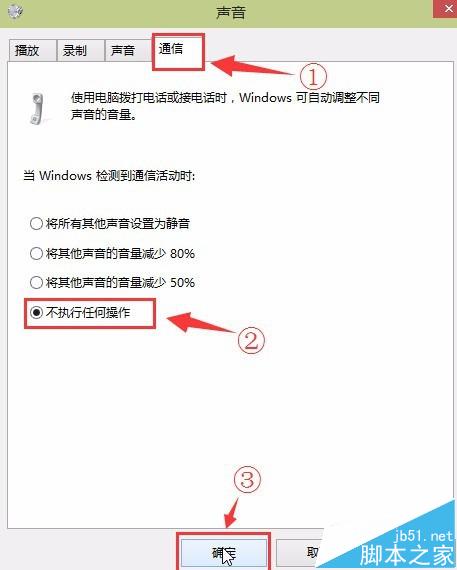 2、在打开的声音窗口中,点击切换到“通信”界面,然后点击选择通信活动为“不执行任何操作”,点击确定完成操作,如下图所示:
