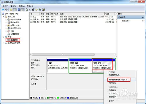 2、依次展开【计算机管理】→【存储】→【磁盘管理】,点击右下角的F盘(图标异常的盘符)右键,选择【更改驱动器号和路径】: