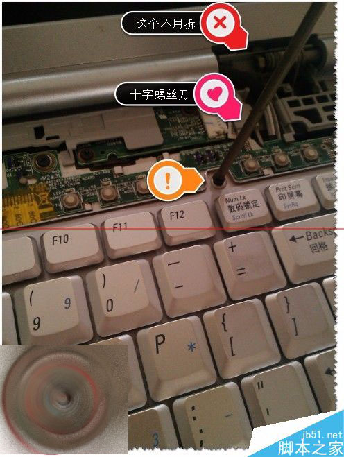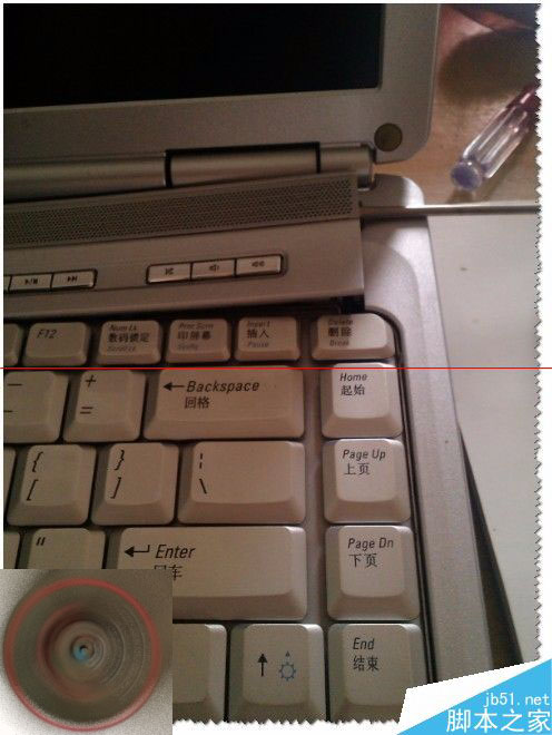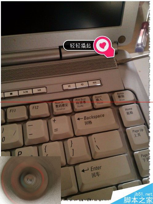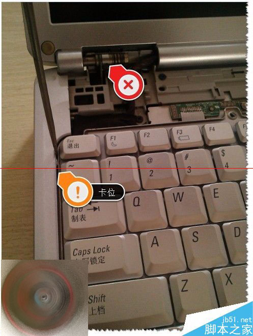 3、把锁键盘的两个螺丝给拆了,还是拿不出键盘的。注意:还是有卡位的如图。用一字螺丝刀在卡位外轻轻往右一推,键盘就松动了。如图