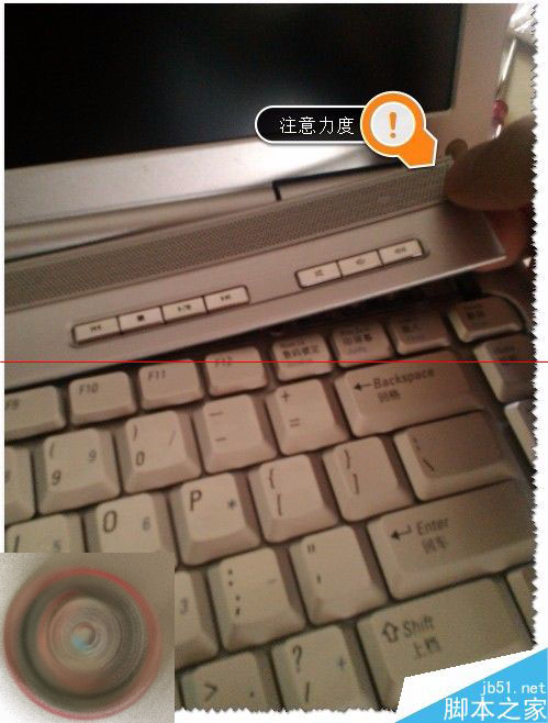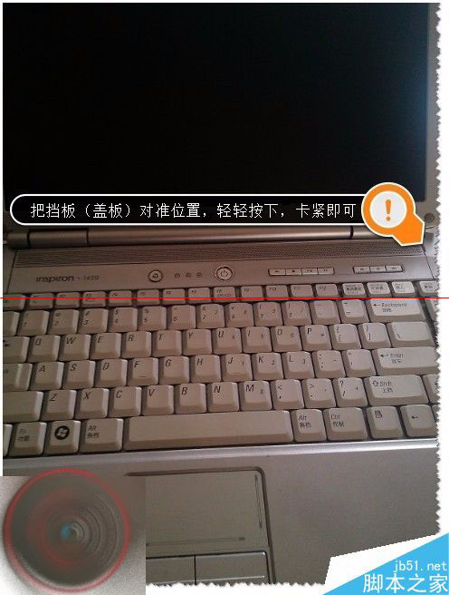 9、笔记本前开机键挡板(盖板)如何安装呢?把挡板(盖板)对准位置,轻轻按下,卡紧即可。如图