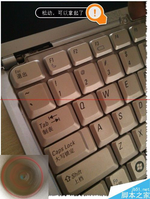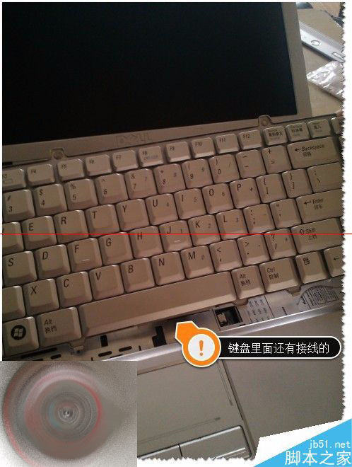 4、这时键盘是松了,但是还是不可以全部拿起来的。不能太用劲了,注意键盘里面还是连接线的哦!!!可以把键盘轻轻翻过来,就可以看到连接线了。如图
