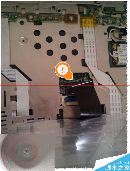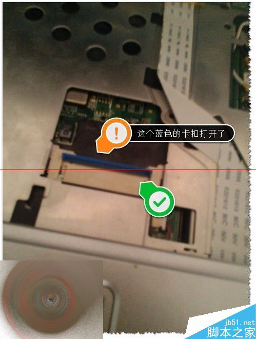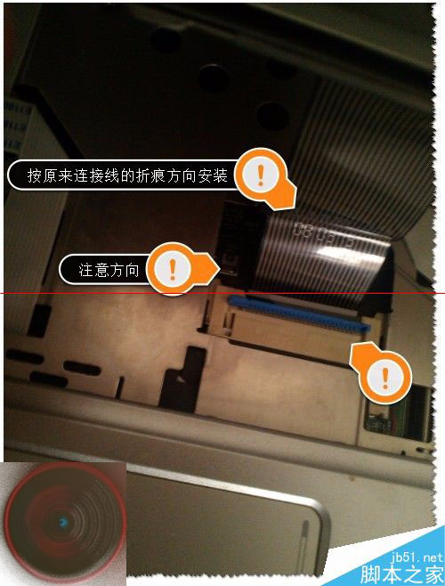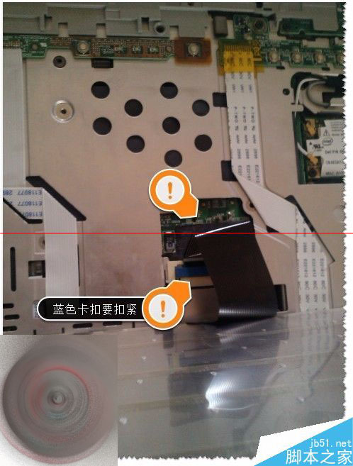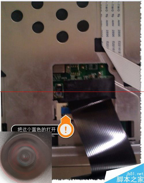 6、拆卸完成了,那么如何安装回去呢?首先打开蓝色卡扣,连接线按原来连接线的折痕方向安装(注意方向不要装反了)。如图