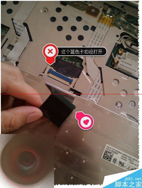 5、注意:要拆键盘一定要把蓝色卡扣打开,才把黑色的连接线拔出来。如图