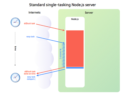 上面提到,如果是I/O任务,Nodejs就把任务交给线程池来异步处理,高效简单,因此Node.js适合处理I/O密集型任务,但不是所有的任务都是I/O密集型任务,当碰到CPU密集型任务时,就是只用CPU计算的操作,比如要对数据加解密(node.bcrypt.js),数据压缩和解压(node-tar),这时Node.js就会亲自处理,一个一个的计算,前面的任务没有执行完,后面的任务只能干等着,如下图所示: