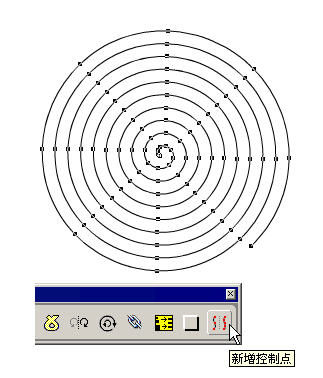 此时这个螺旋对象仍旧处于被选择状态,使用菜单命令:外加功能>扭曲>新增控制点,或是打开外加功能操作面板,点击新增控制点按钮就可以了。使用这个命令可以在每段路径上新增加一个控制点。