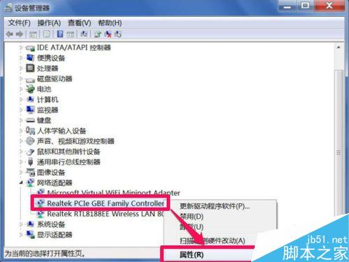 在网络适配器下,如果只有一种设备,大多为本地网卡,就无须选择了,直接右键,选属性;但是,如果有两种,一般是无线网卡,以及本地网卡,则当前使用的是哪种,就在哪一项上面右键,选择菜单中的“属性”这一项。