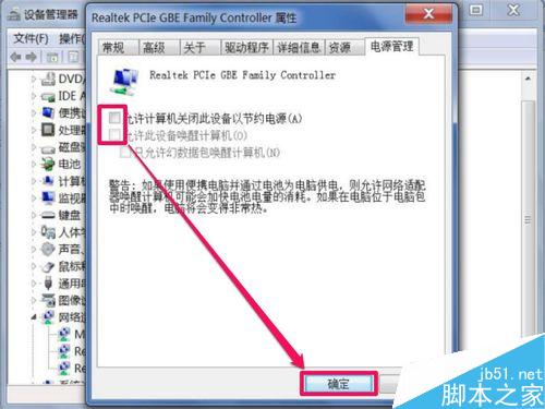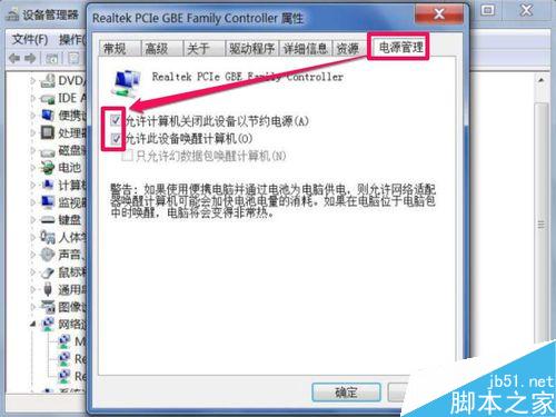 还有一个地方要设置,就是电源管理选项卡,在其下,将“允许计算机关闭此设备以节约电源”和“允许此备唤醒计算机”前面的勾去掉。