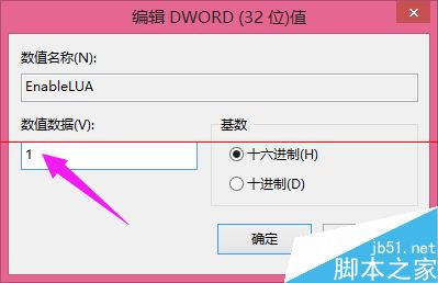第三步,双击EnableLUA把数值数据改为1;修改完成重启电脑;