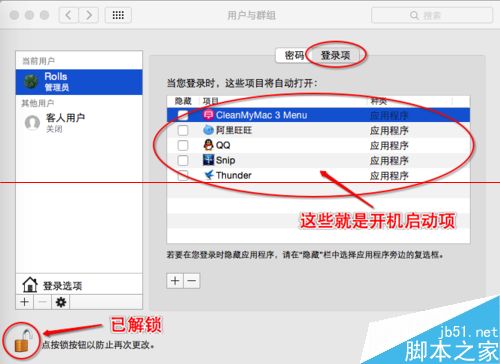 4、已解锁的话,可以看到左下角黄色的锁已经打开了,现在就可以修改设置了。可以看到这些都是开机启动项;