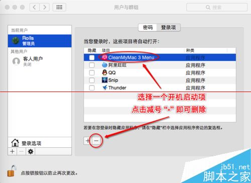 5、选择一个开机启动项,点击减号“-”即可删除掉它(如图所示);