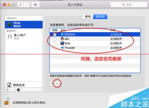 6、删除第一个后,同理,下面的都可以点击减号“-”删除。相反,点击加号“+”也可以添加某应用程序作为开机启动项。
