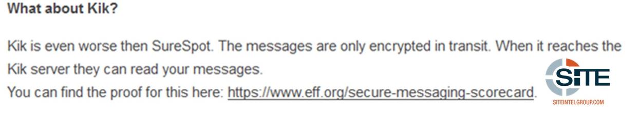 实际上,Kik和SureSpot在ISIS内部的地位,和WhatsApp是差不多的。ISIS也并不推荐成员使用这两款工具,相关这些应用使用的警告项目都会时不时地出现在ISIS社区,比如像下面这样的: