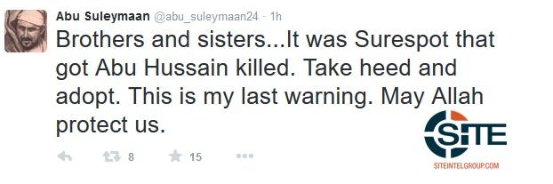 去年八月初,美国中央情报局将Abu Hussain列为打击ISIS的第三号人物,后来美国在一次无人机空袭行动中炸死了Hussain 。这次事件发生之后,ISIS成员Abu Suleymaan发出警告信息:“兄弟姐妹们,是SureSpot导致了Abu Hussain被杀害。请各位留意,这是我最有一次发出警告。”