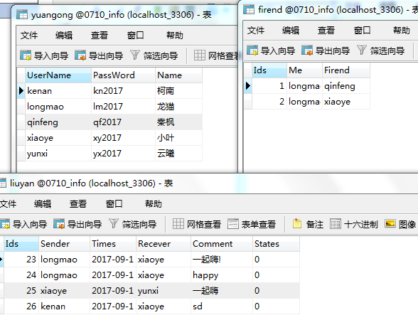 3.登录完成后是进入主页面,也就是显示自己收到的对话内容,下面是设计的数据库的表格和主页面的代码: