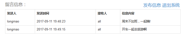 代码写到这里,比较重要的部分就完成了,下面是要进入发布信息页面了,相当于之前写的添加的页面,其处理页面也是和之前没什么区别的,差别在于现在的处理页面是在用户登录的情况下操作的,需要用session把所有的登录情况下的页面连接起来