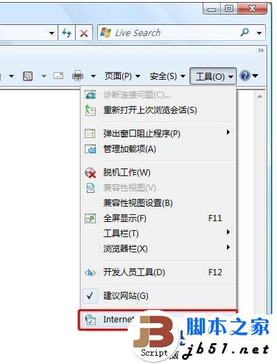 点击 IE 右上角的工具按钮,在菜单中选择“Internet 选项