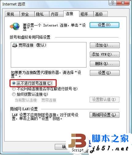 在“Internet 选项”的“连接”标签里,点选“从不进行拨号连接