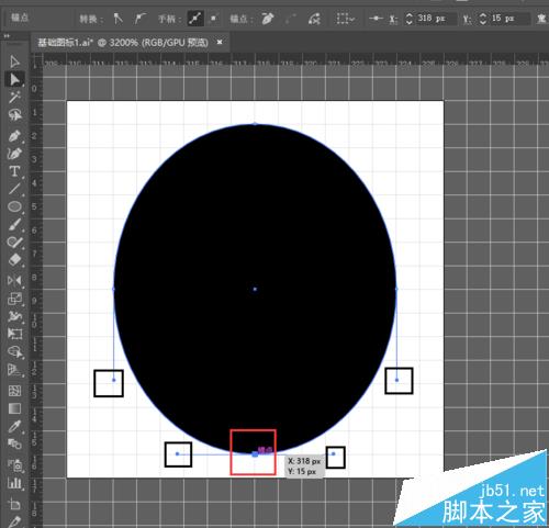 6、用直接选择工具、选择椭圆上方瞄点,往下移动锚点;