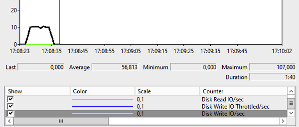 我们从开始就创建了资源池,现在在我们在我们的资源池里并没有限制。因此当我们现在进行刚才创建的非聚集索引的索引重建时,SQL Server会占用大量的IOPS。我们可以通过性能监控里的“SQL Server:Resource Pool Stats:Disk Write IO/Sec”性能计数器来验证刚才创建的资源池。