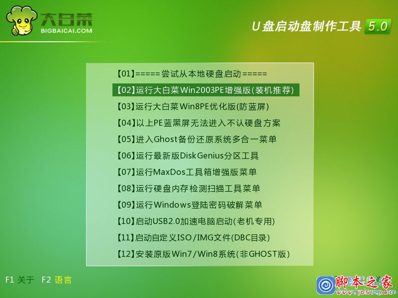 第四步:当进入到大白菜启动u盘主界面的时候,我们按上下方向键将光标选择到“【02】 运行大白菜Win2003PE增强版(装机推荐)”后,按下回车键进入;