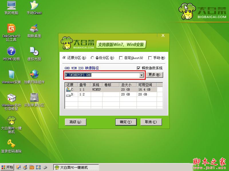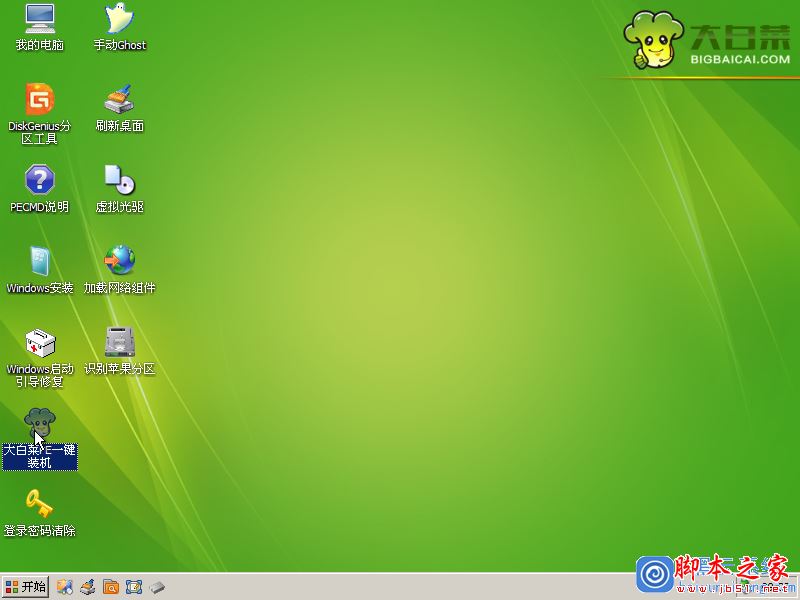 当进入Win2003PE系统桌面后,如果“大白菜PE一键装机”工具没有自动运行的话,我们就手动双击该软件运行它即可!如下图所示:
